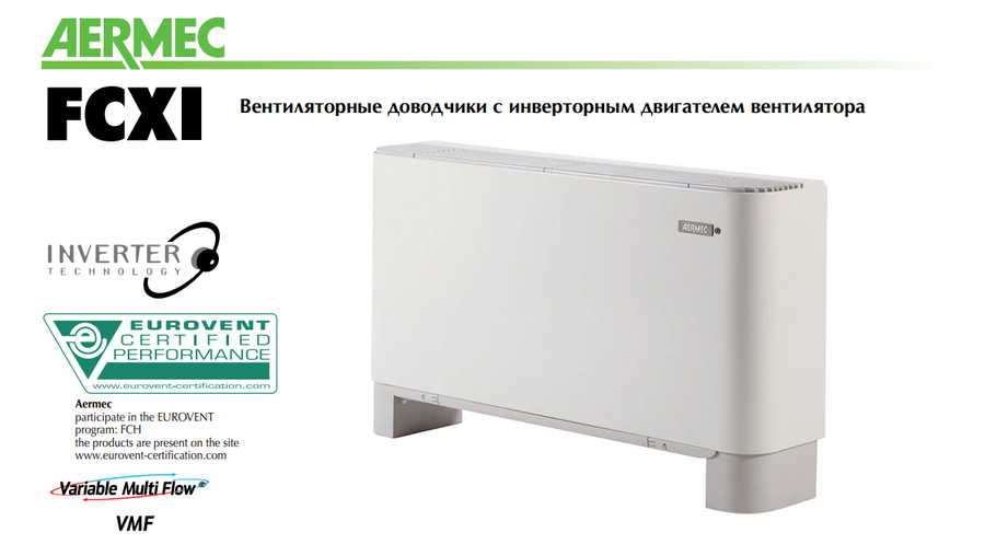 Компания Aermec предоставляет широкому пользователю серию инверторных фанкойлов или же вентиляторных доводчиков - FCXI со стандартным и увеличенным теплообменником. Здесь и постоянное регулирование скорости воздуха с подстройкой под изменения в помещении благодаря инвертору. Это дает энергосбережение, комфортное пребывание и уменьшение шума в отличие от обычных систем. Возможность разновариантной установки блока - пол, стена, потолок. Поступает без панели управления, для вертикальных моделей есть ножки.