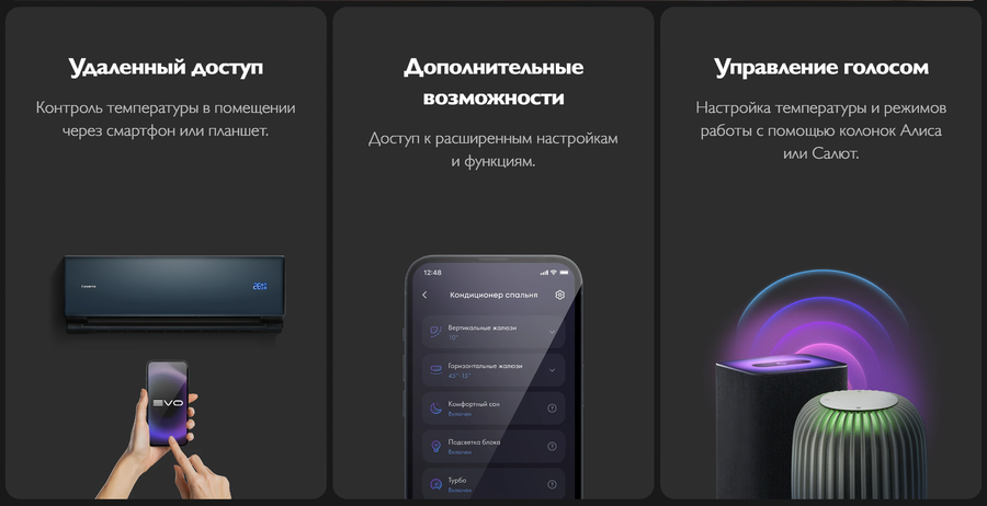 - Настройка температуры и режимов работы с помощью голосовых колонок Алиса или Салют