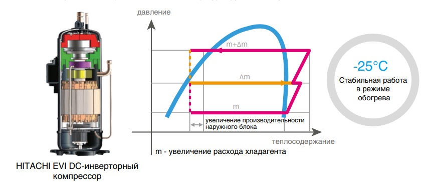 - Компрессоры DC-инверторного типа HITACHI с функцией EVI (впрыск пара хладагента)