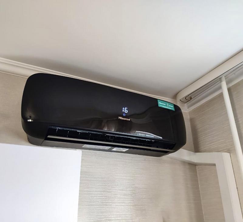 В один этап установили кондиционер Hisense AS-10HW4SYDTG5B. Монтаж стандартный: внешний блок под окно, трассы спрятаны в белом коробе. Внутренний блок разместили рядом с окном, поэтому при закрытых шторах не видно место, где проходят коммуникации.